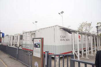 接下来,我们又参观了华为的集装箱数据中心——标准、先进、创新机房的代表。集装箱数据中心,本来只是因为华为企业数据中心机房面积的限制,而企业又迅速发展机房容量不够用,传统的数据中心机房建设周期通常在两年以上,远不能满足流媒体等数据业务井喷式的发展需求,集装箱式的数据中心解决方案应运而生。华为的集装箱式数据中心产品分为两大类标准产品:一类称为“All-in-one式集装箱”,即一个标准集装箱内集成所有的基础设施;另一类称为“集群式集装箱”,即由不同的箱体形成制冷、供配电、设备安装等功能模块,进行灵活组合应用。作为一种新型的建设模式,集装箱式数据中心具备如下特点: