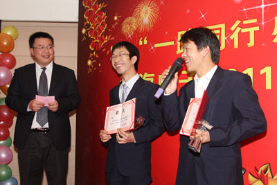 工作报告结束、短暂休息后,我们的主持人带着大家进入了议程中令人兴奋与激动的优秀员工表彰及员工精神传送时刻。企业要发展就得要有创新,今年公司结合传统的评选方式,也同时启动了新的评选方式:2011年度共设置5个奖项,评选出7名优秀员工、1个优秀团队。